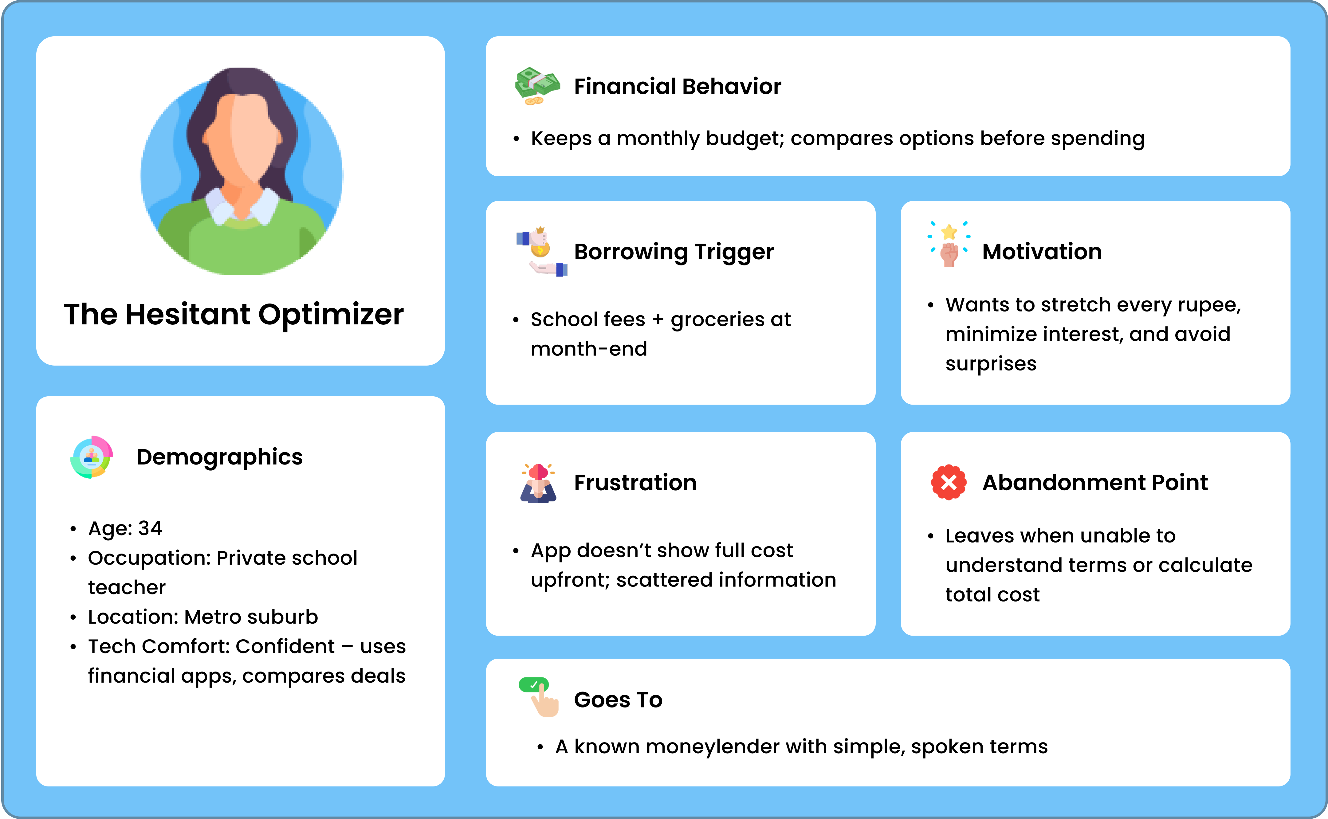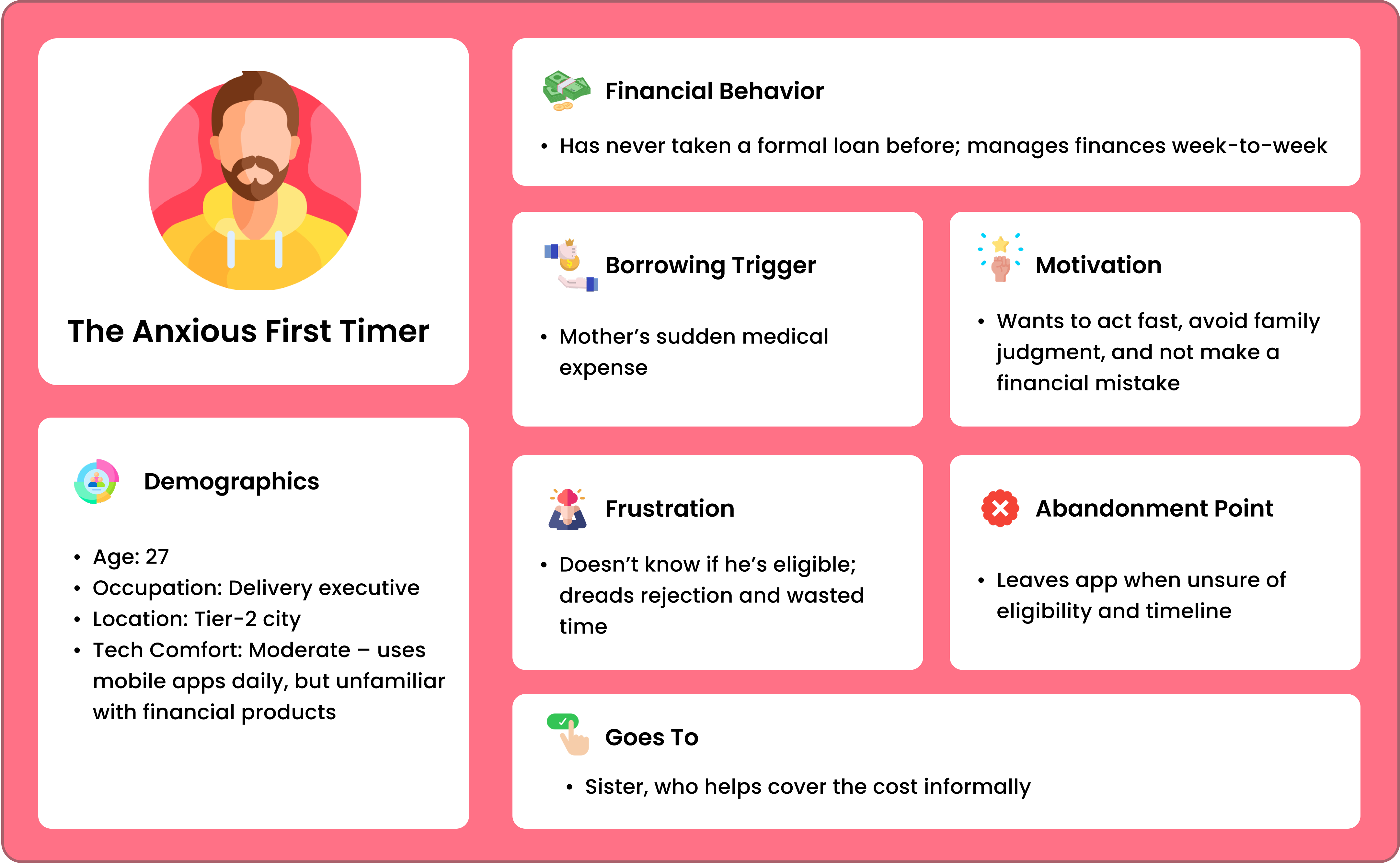 The Anxious First Timer → Urgent needs but no prior loan experience. Hesitates at eligibility, fears wasted effort, and easily abandons when clarity is missing.