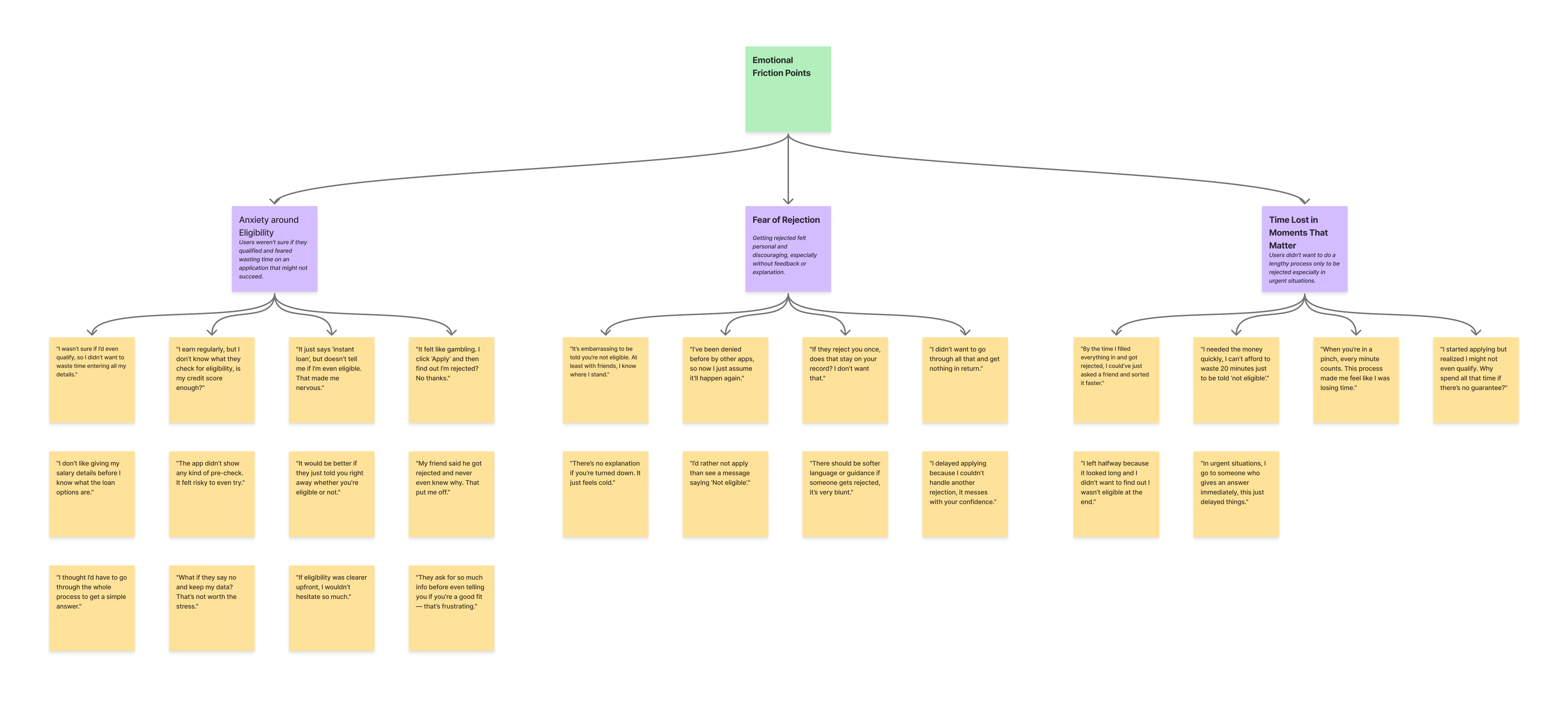 Journey maps revealed the emotional peaks and drop-off moments driving loan abandonment. Although each persona had unique motivations, one common theme emerged: